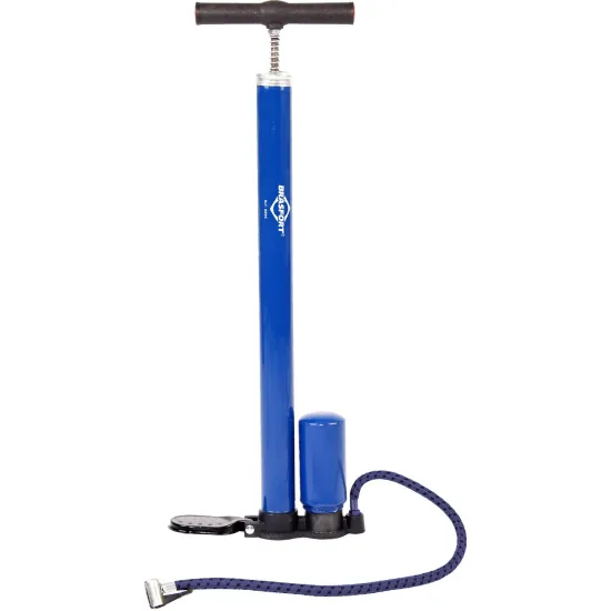 Corpo em aço carbono com pintura em epoxi na cor azul, mangueira de borracha com revestimento na cor azul.