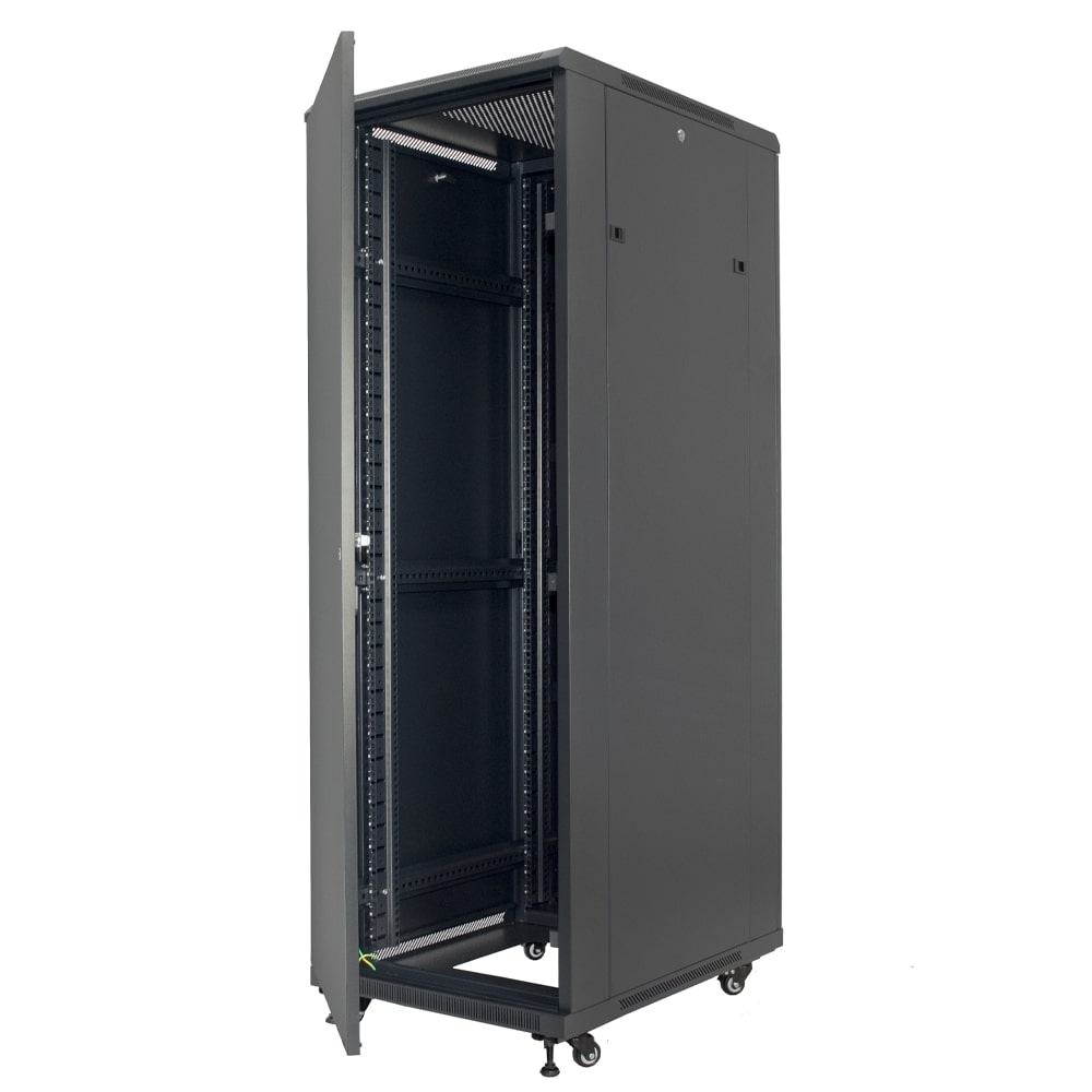 Padrão 19" Polegadas, com porta frontal com ângulo de abertura de 180º em vidro temperado e fechadura com chave. 4 aletas laterais de fixação com furos numerados e pés com niveladores, possui painéis laterais removíveis com fecho rápido e porta traseira chaveada.